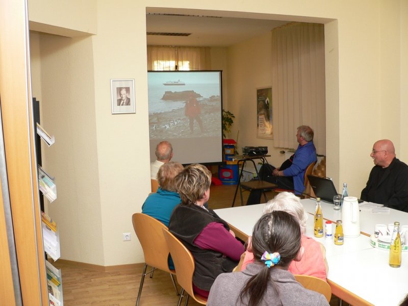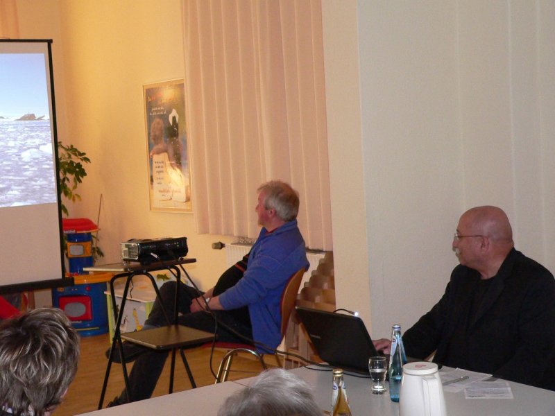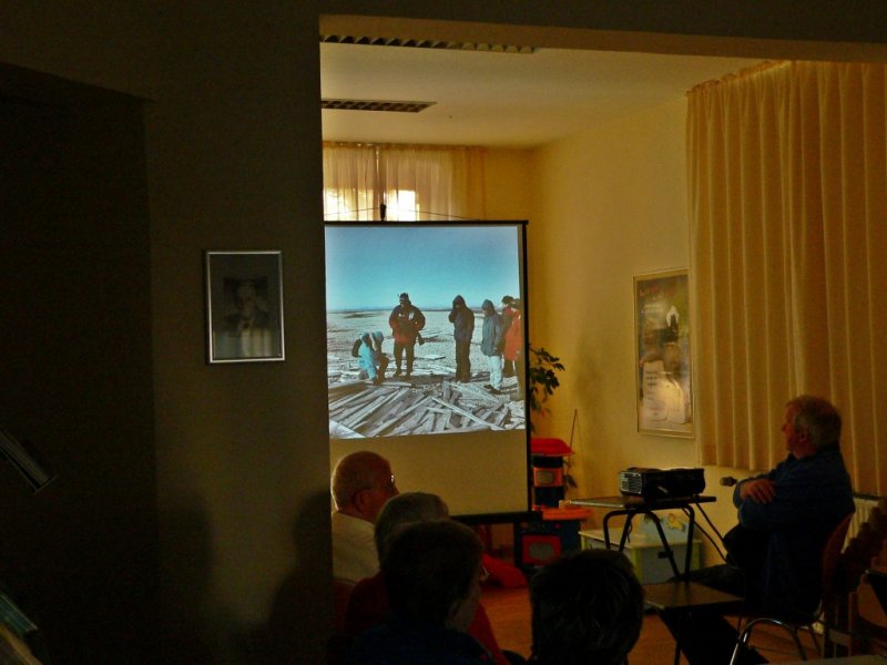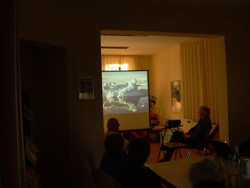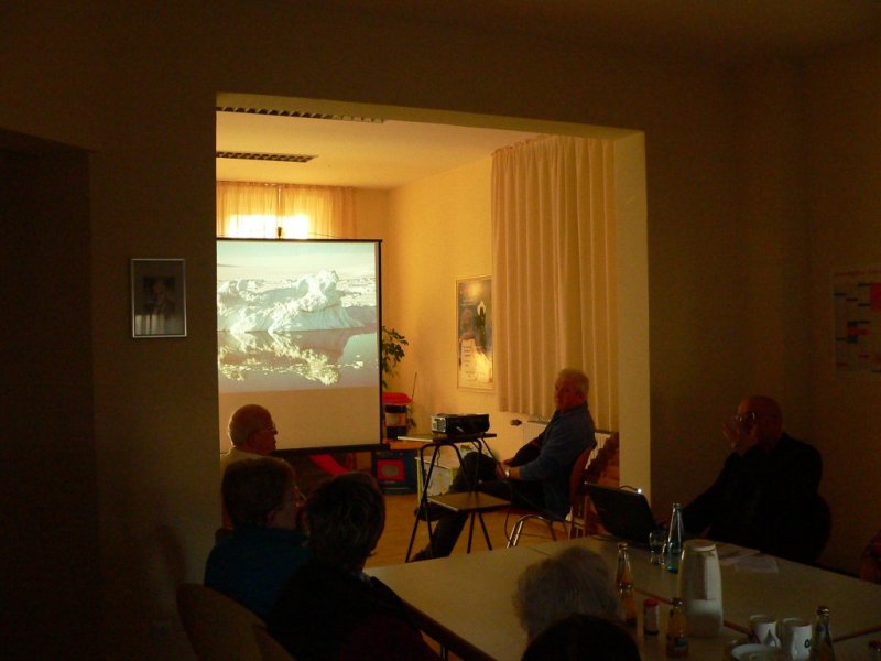 In den Bildern zeigte er den 20 Besuchern die hohen Eisberge und die Gletscher auf seiner Expedition zum Osten Grönlands. (Dieses Gebiet kann man mit dem Schiff nur im September erreichen) Er besuchte die einzige Stadt im Osten Grönlands. Hier leben ca. 1500 Menschen die vom Jagen und vom Fischfang leben. Sie sind aber mit der Außenwelt immer in Verbindung z.B. Telefon undInternet. Es gibt einen kleinen Flugplatz, der aber nur in Notfällen genutzt wird.
